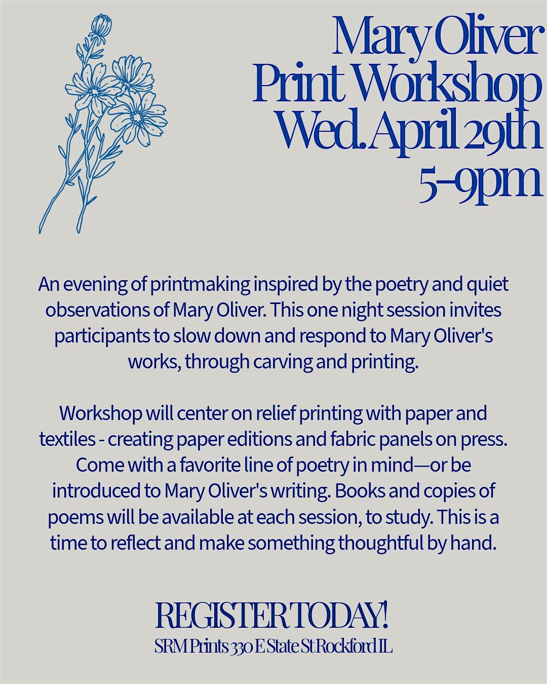 Spend an evening at SRM Prints exploring printmaking inspired by the poetry and quiet observations of Mary Oliver. Her writing invites us to slow down, notice the natural world, and reflect on the small details that shape our days—an approach that pairs beautifully with the thoughtful rhythm of carving and printing by hand.