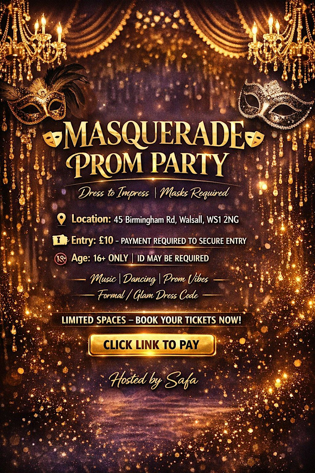 culture at our 16+ Masquerade Prom. Complimentary masks are provided on arrival. Enjoy a curated playlist of Dancehall, Afrobeats, and Bollywood favourites while showing off your best outfit.