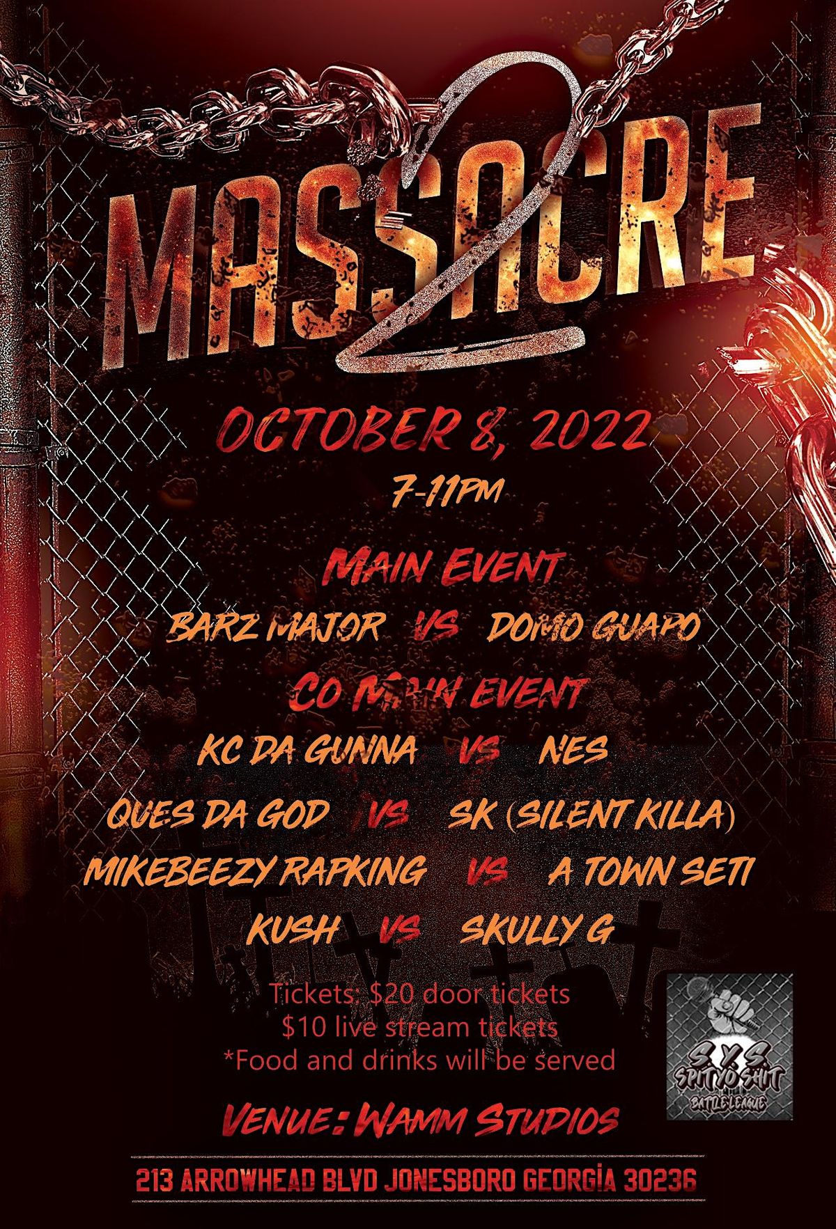 SYS Battle League will be hosting another must see battle rap event on October 8, 2022 at Wamm Studios in Jonesboro Georgia. Massacre 2