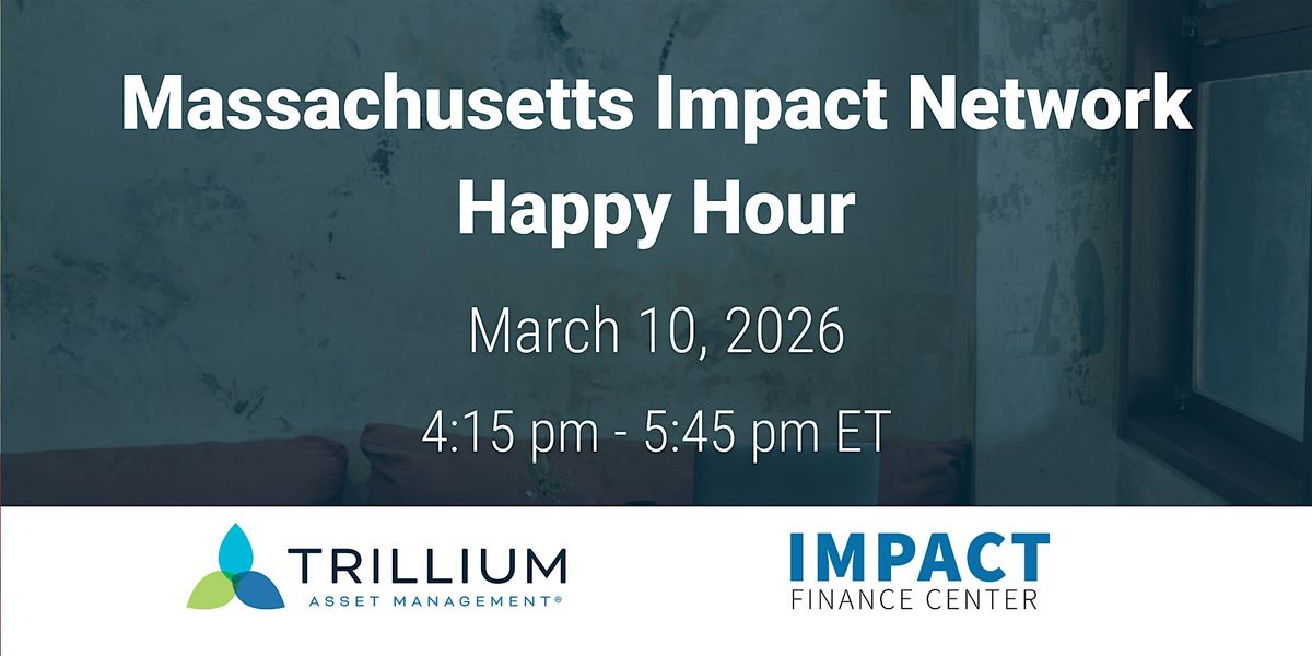 Join Trillum Asset Management and Impact Finance Center for a special happy hour to celebrate this year's upcoming MA Impact Days conference. We invite you to relax and expand your impact investing network over light hors d'oeuvres and a beverage. Look forward to seeing you there!