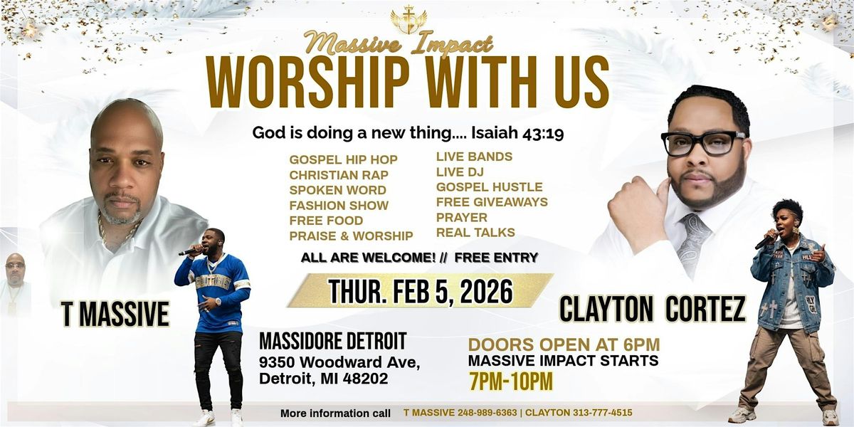 Get ready for an extraordinary evening at the MASSIVE IMPACT "NEW HIP HOP CHURCH" event, taking place at the iconic MASSIDORE located at 9350 Woodward Ave, Detroit, MI 48202 on Thursday, February 5, 2026, at 6:00 PM (doors open).