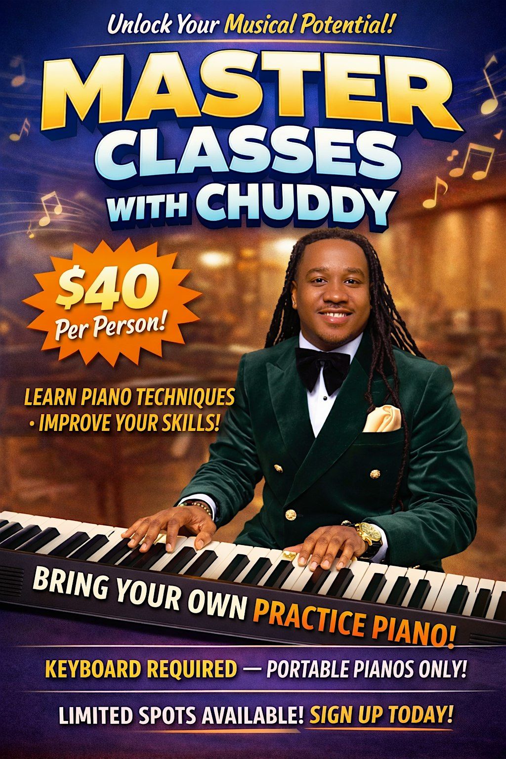 Unlock your musical potential and take your piano skills to the next level! Join us for an interactive Master Class with Chuddy, where aspiring pianists of all levels can learn, play, and grow under expert guidance.