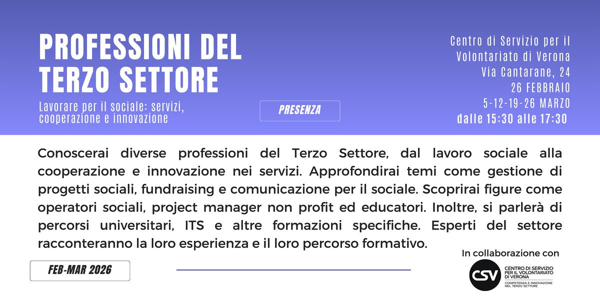 Potrai conoscere le diverse professioni del Terzo Settore: dal lavoro sociale alla cooperazione, dall’innovazione nei servizi alla gestione di progetti. Scoprirai figure come l’operatore sociale, il project manager non profit e l’educatore, esplorando anche temi come fundraising e comunicazione per il sociale. Approfondirai i percorsi di studio, tra università, ITS e formazioni specialistiche, che portano a queste carriere. Esperti del settore condivideranno la loro esperienza e il loro percorso professionale.