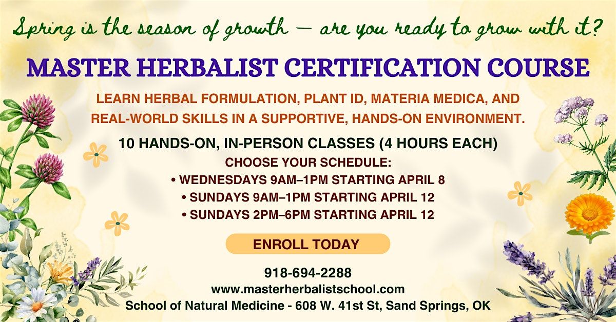 For more information or the enroll contact us at: 918-694-2288, www.masterherbalistschool.com, or [email protected]