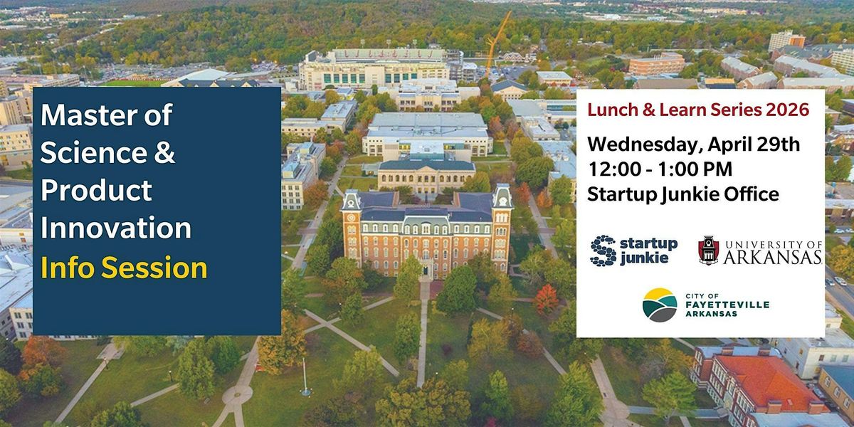 Join Startup Junkie for a Lunch & Learn featuring the University of Arkansas’s Master of Science in Product Innovation (MSPI) program. This session will provide an inside look at how the program equips students with the tools to turn ideas into impactful products—bridging creativity, business strategy, and real-world execution.