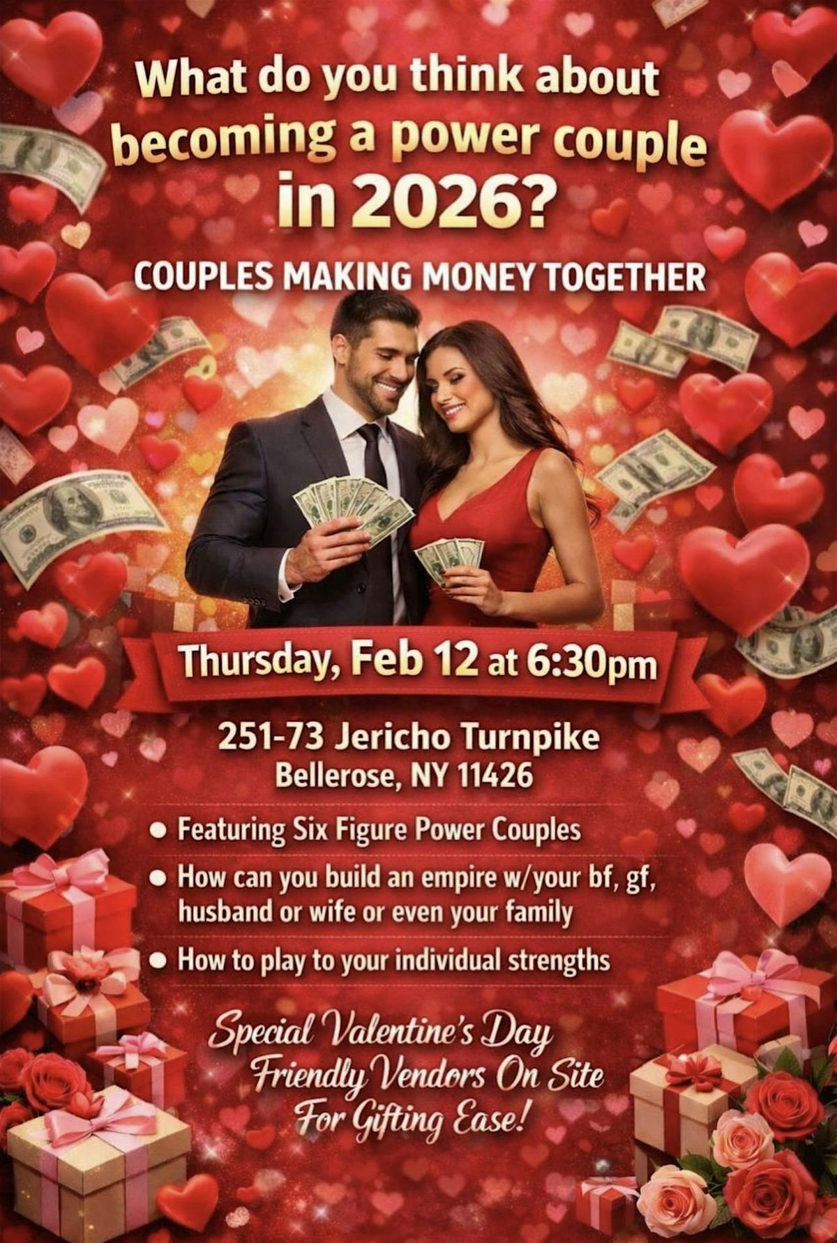Becoming a Power Couple in 2026 is a special Valentine’s-themed experience for couples and partners who want to grow in love and finances. Join us for an exciting evening featuring real six-figure power couples sharing how they built success together, played to their individual strengths, and turned teamwork into income.