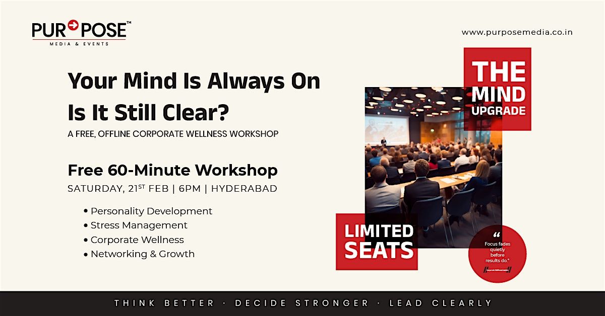 The Mind Upgrade is a free, 60-minute, offline self-development and corporate wellness workshop designed for startup and corporate professionals who want to sharpen their thinking, strengthen their personal presence, and grow with purpose in demanding work environments.