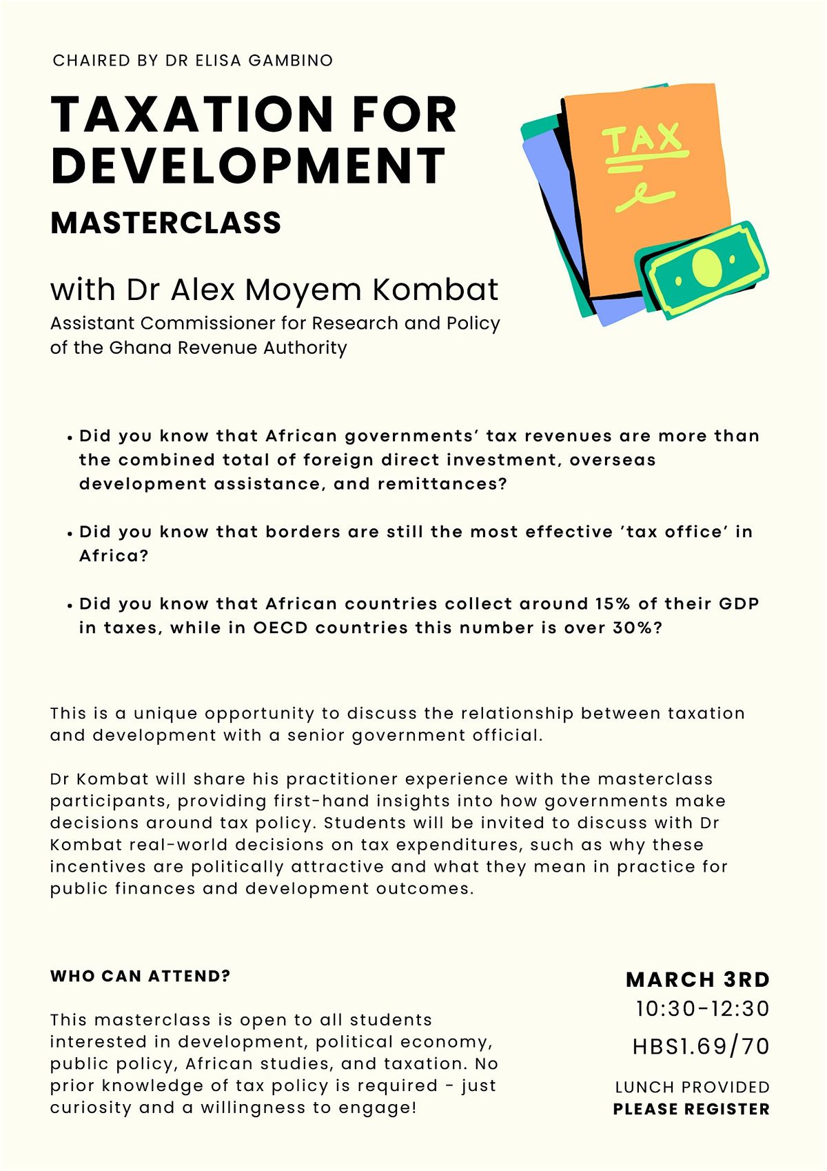 This masterclass is open to all students interested in development, political economy, public policy, African studies, and taxation. No prior knowledge of tax policy is required - just curiosity and a willingness to engage!