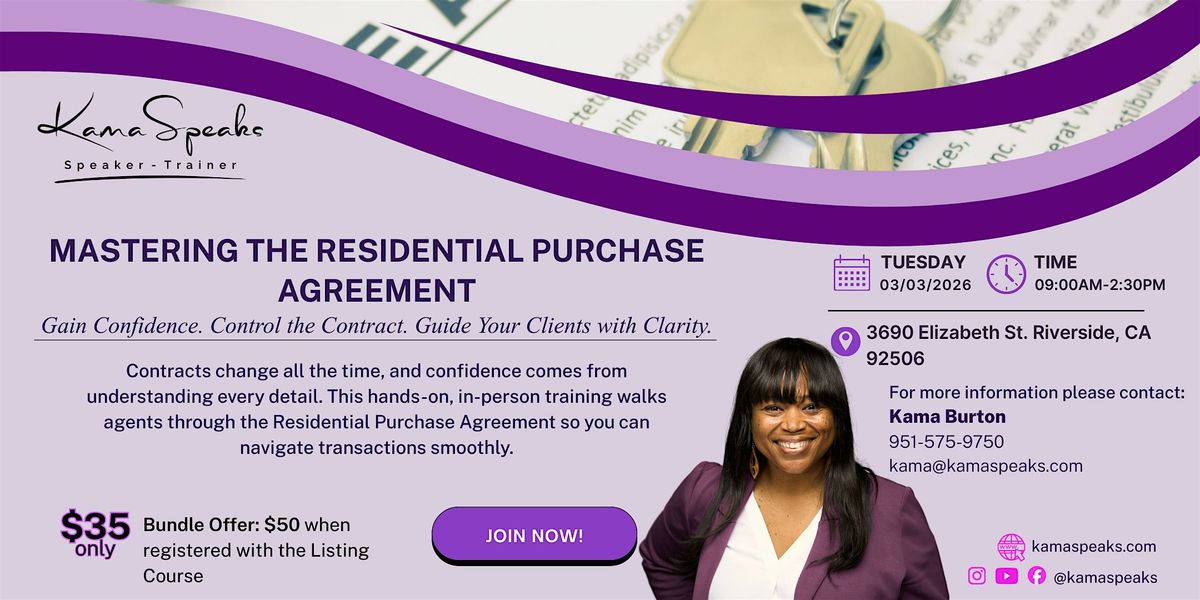 Real estate contracts change constantly, and staying ahead of those changes is the key to a smooth transaction. Join renowned speaker and trainer Kama Burton for a comprehensive, hands-on, in-person training session designed specifically for real estate agents.
