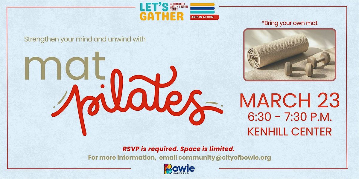 Join us for Mat Pilates on March 23 from 6:30 to 7:30 p.m. at Kenhill Center. Experience the art of Pilates, where mindful movement strengthens both body and mind. This low-impact, full-body workout builds core strength, enhances flexibility, and improves posture, all while cultivating grace, balance, and focus.