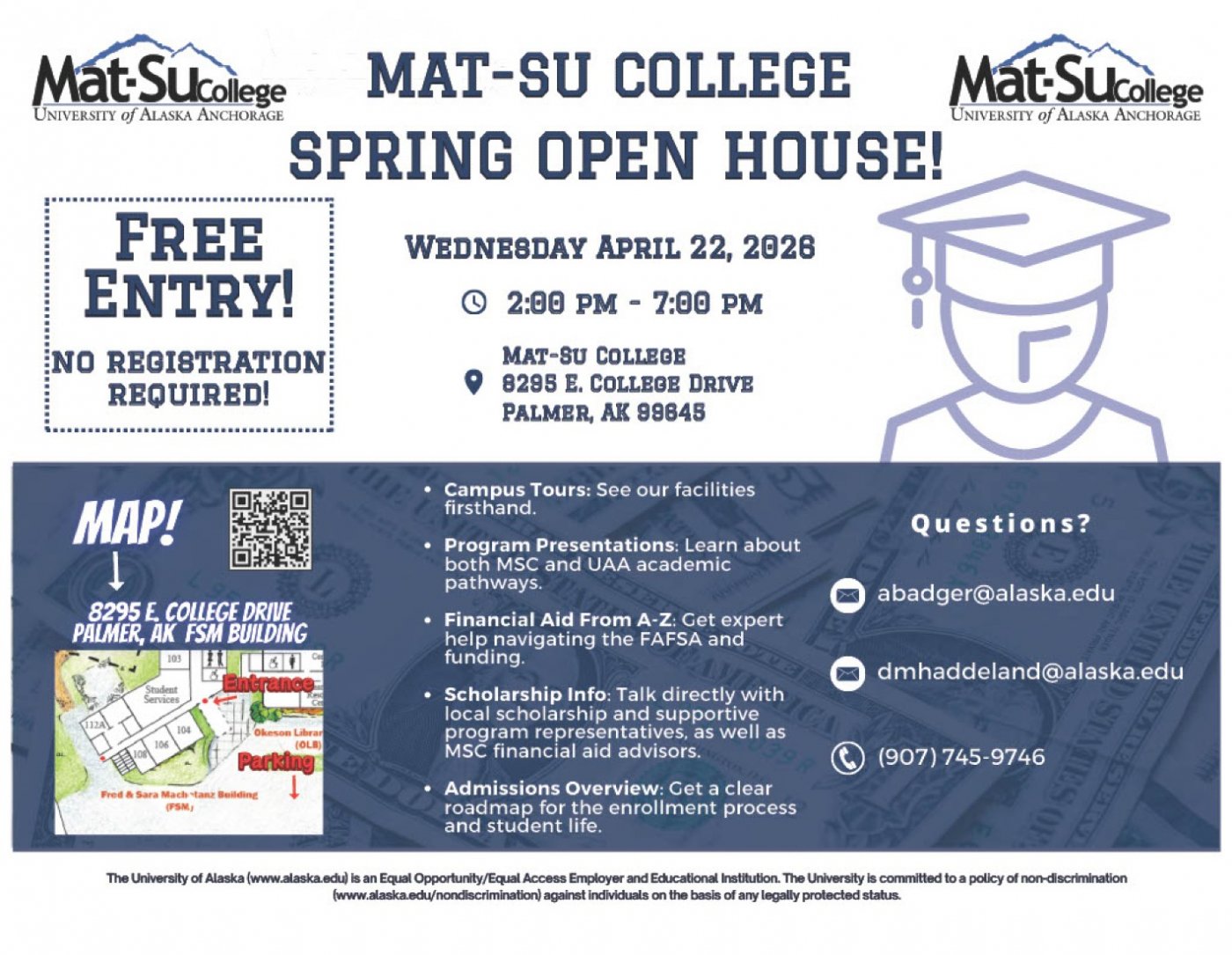 Explore everything Mat-Su College has to offer during this comprehensive event. Take a campus tour and see our facilities firsthand, attend program presentations to learn about both MSC and University of Alaska Anchorage academic pathways, and get expert guidance on financial aid—from navigating the FAFSA to understanding your funding options. You’ll also have the opportunity to speak directly with local scholarship and supportive program representatives, connect with MSC financial aid advisors, and receive a clear overview of the admissions process and student life to help you confidently plan your next steps.