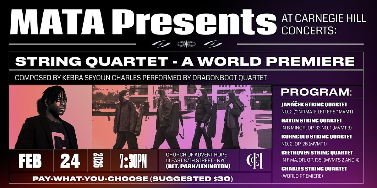 MATA Presents at Carnegie Hill Concerts: “STRING QUARTET” - A World Premiere composed by Kebra Seyoun Charles performed by DragonBoot Quartet