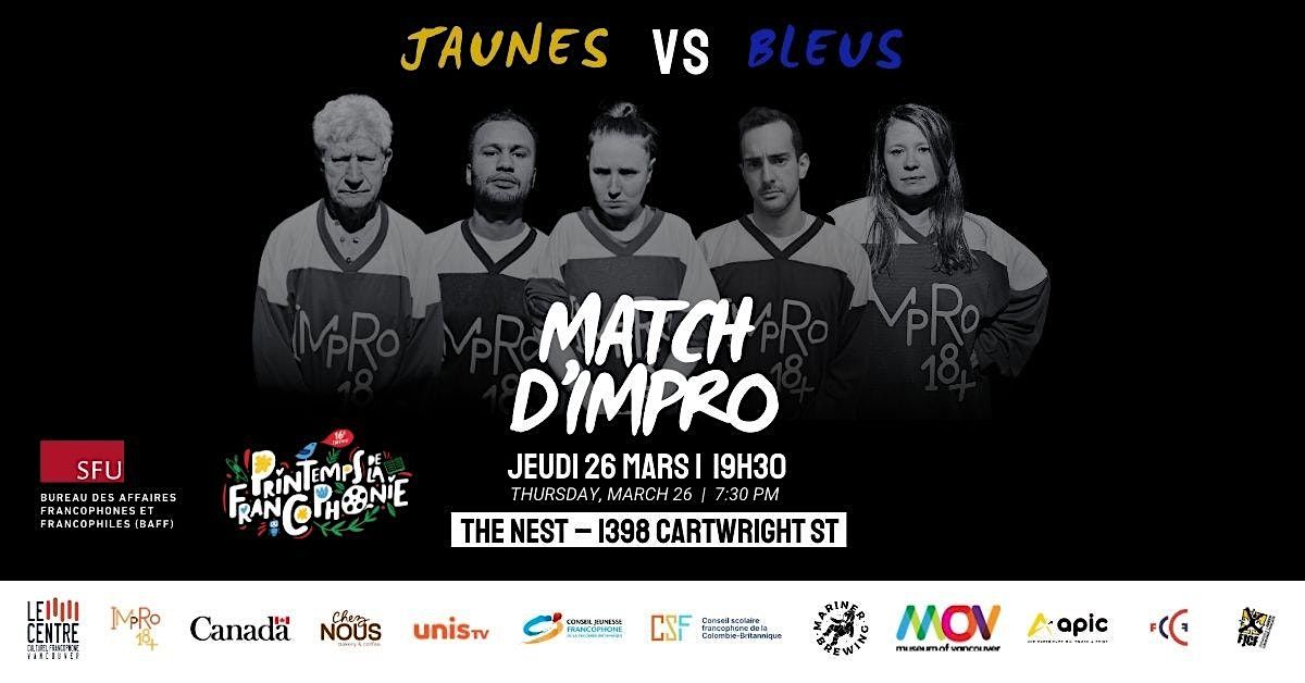 Dans le cadre du Printemps de la francophonie de l’Université Simon Fraser (SFU), le Bureau des affaires francophones et francophiles de SFU et le Centre culturel francophone de Vancouver vous invitent à une soirée « Match d’impro ». À cette occasion, deux équipes de la ligue d’Impro 18+ s’affronteront le jeudi 26 mars prochain à la salle The Nest (1398 Cartwright St).