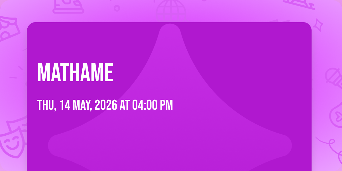 🌟 Be part of history at Mathame, an extraordinary gathering that will captivate your imagination! 🏛️ The prestigious Beach House Grill in San Diego, CA sets the stage for an unforgettable experience on May 14th, 2026 at 04:00 PM. ✨ They are bringing together the finest elements of entertainment and innovation to create moments that will take your breath away. From the moment you arrive, you'll be immersed in an atmosphere of wonder and excitement. 🎯 This carefully planned event ensures every guest experiences something truly special. 🎊 Early booking is recommended for this must-attend event of the season!http://maps.seatics.com/GeneralAdmissionEvent_2021-07-08_1018_09072021_221606_SVGC_tn.png