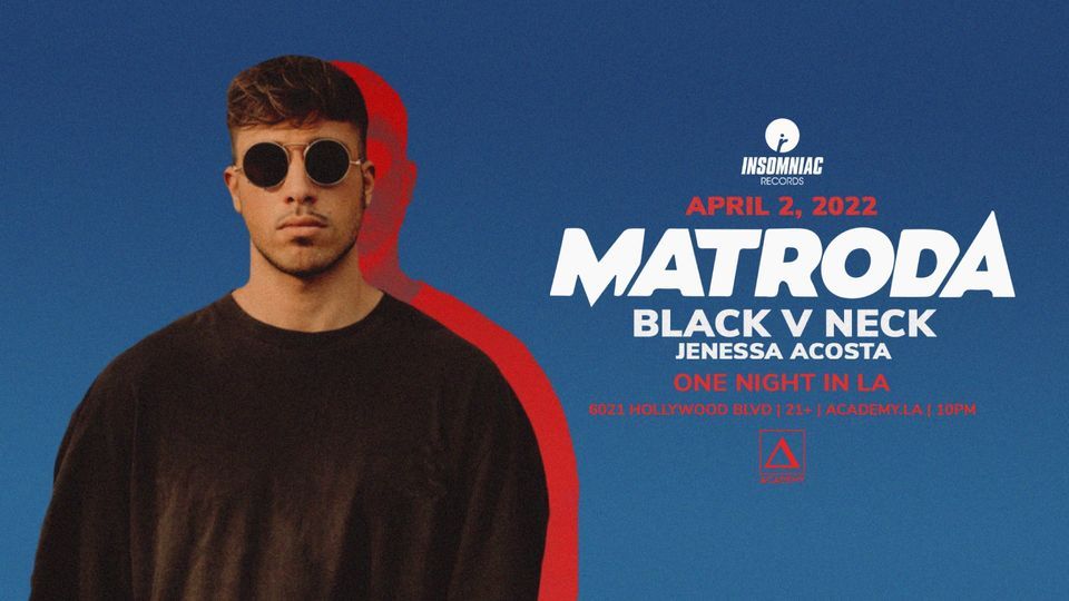 Don't miss One Night in LA with Matroda, Black V Neck and Jenessa Acosta for Insomniac Records Saturday, 4/2! ? Tix on sale NOW → academy.la/matroda
