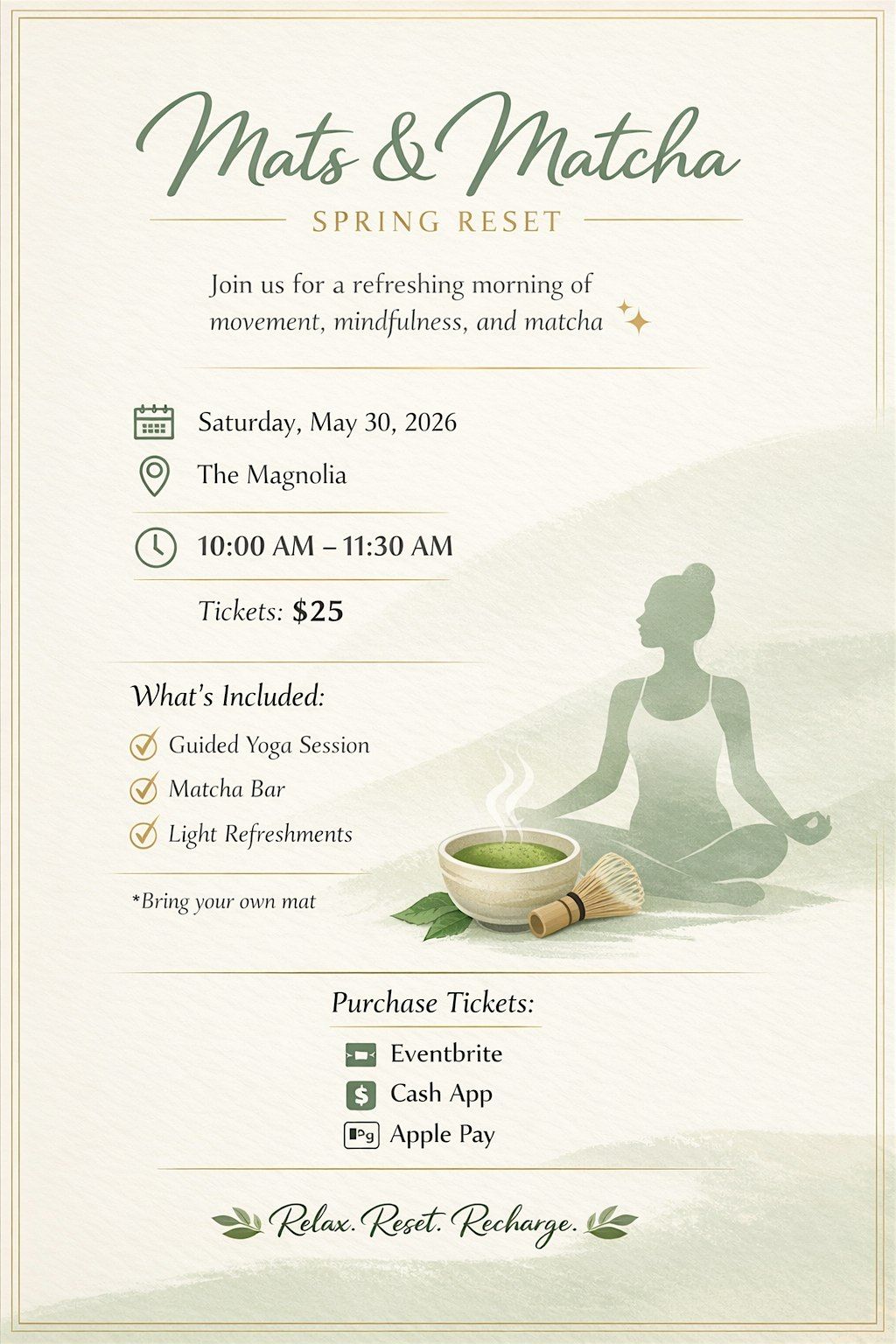 Mats & Matcha: Enjoy yoga, matcha, and light bites. Relax, recharge, and connect while supporting your mental and physical wellness.About this Event