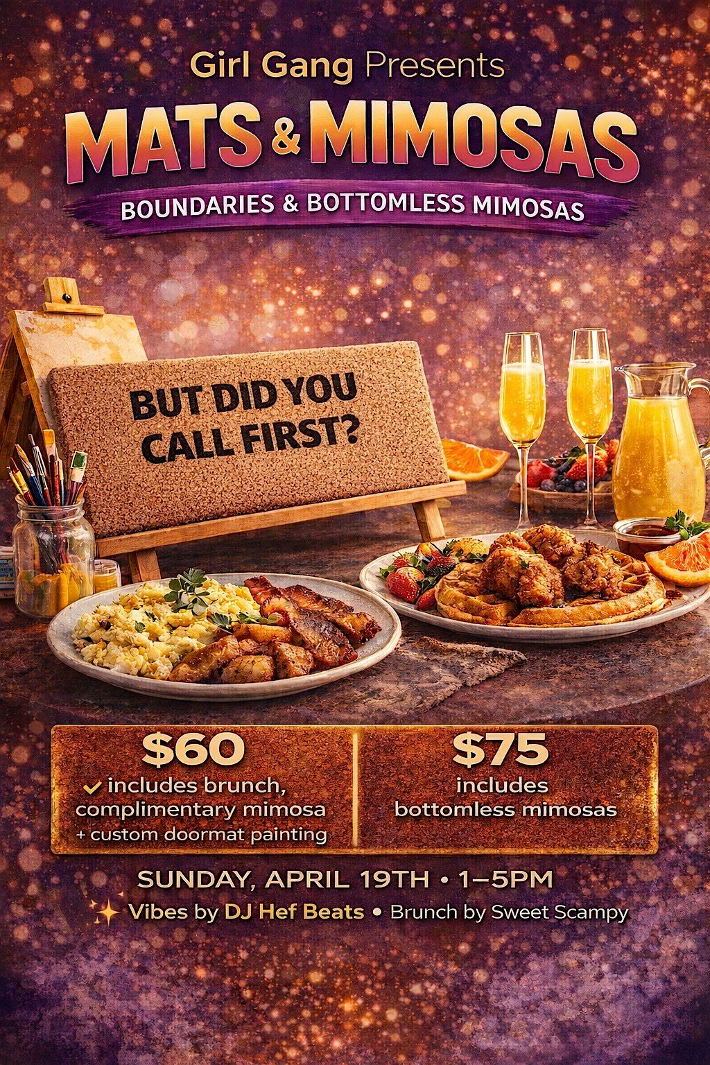 Cost includes Brunch, complimentary mimosa or bottomless mimosas, doormats and all painting materials.