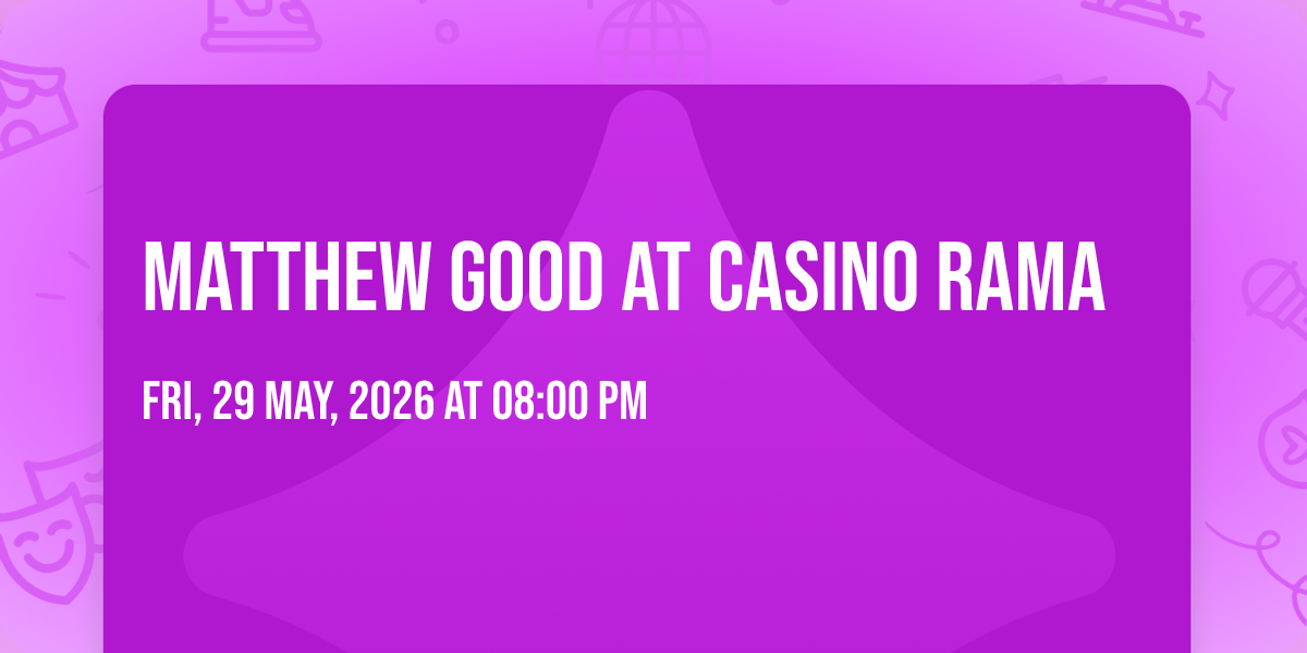 β¨ Embark on an extraordinary journey at Matthew Good at Casino Rama, where every moment promises to be unforgettable! π Imagine of transforming Casino Rama in the heart of Orillia, ON into a realm of endless possibilities. π Join us on May 29th, 2026 at 08:00 PM for an experience that will challenge your imagination and exceed your expectations. π― This carefully curated event combines the finest elements of entertainment, innovation, and community spirit. Whether you're an adventure seeker, culture enthusiast, or someone looking for unique experiences, this event offers something special for everyone. π Don't miss this chance to be part of something extraordinary!
