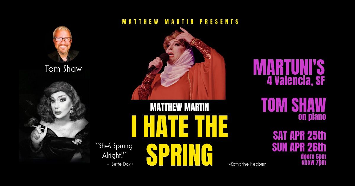 Matthew Martin, a native San Franciscan, has spent years delighting audiences by bringing classic Hollywood legends to life on stage and screen — from Katharine Hepburn, to Bette Davis, Joan Crawford, Judy Garland and beyond. An actor, singer, dancer, director, choreographer, and master of transformation, Matthew has appeared in numerous productions, including D’Arcy Drollinger’s upcoming film Lady Champagne. He recently reprised his beloved role as Blanche Devereaux in The Golden Girls Christmas Show at the Curran Theater. Matthew is thrilled to return to Martuni's, bringing you I HATE THE SPRING.