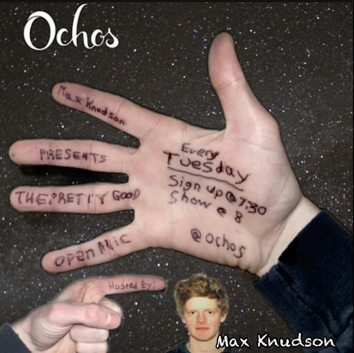 Max Knudson has partnered with Ochos to revive his Pretty Good Open mic. Come on over every Tuesday for some drinks and giggles! Sign ups @7:30 show @8.