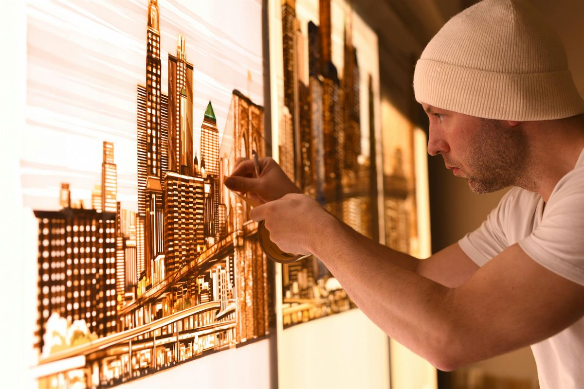 Zorn is globally renowned for his tape art—a technique using packing tape and scalpel on acrylic glass. His works are created by layering tape and only reveal their full impact when illuminated in lightboxes: atmospheric, cinematic, and poetic.