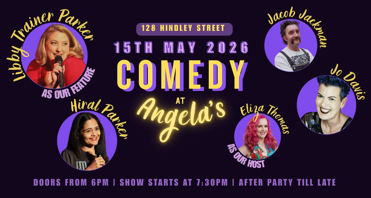 Join us on Friday, May 15th at Venue on Hindley for another top-tier night of stand-up, brought to you by Comedy at Angela’s! This week’s killer lineup includes the wonderful Jacob Jackman, Hiral Parker, Jo Davis, and Eliza Thomas as our host. With the feature of the night being the incredible Libby Trainer Parker, this lineup is certainly not one to be missed...