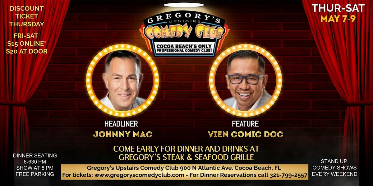 Come see the best touring comedians from all over the country performing every weekend at Gregory's Comedy Club. Enjoy upscale dining with the best local staff Cocoa Beach has to offer! Seating starts 2 hours prior to showtimes. This week nationally touring comedian Johnny Mac (HBO, Gotham Comedy Club, Catch a Rising Star) headlines. His fun, relatable and hilarious comedy has been a hit all over the country! with Sarasota favorite Vien The Comic Doc featuring!