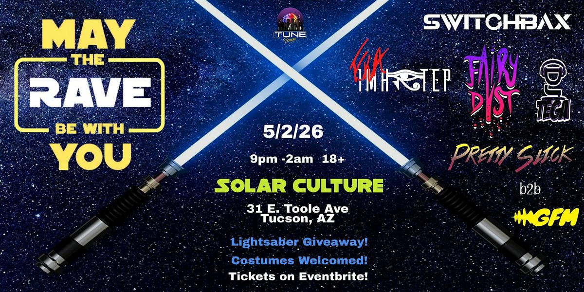 Join us at the infamous Solar Culutre Warehouse Art Gallery in Tucson, AZ for pounding bass, flashing lights and all things Star Wars. We have amassed a superb talent of DJs to bring you all the grooves to celebrate the incoming "May The 4th Be With You"