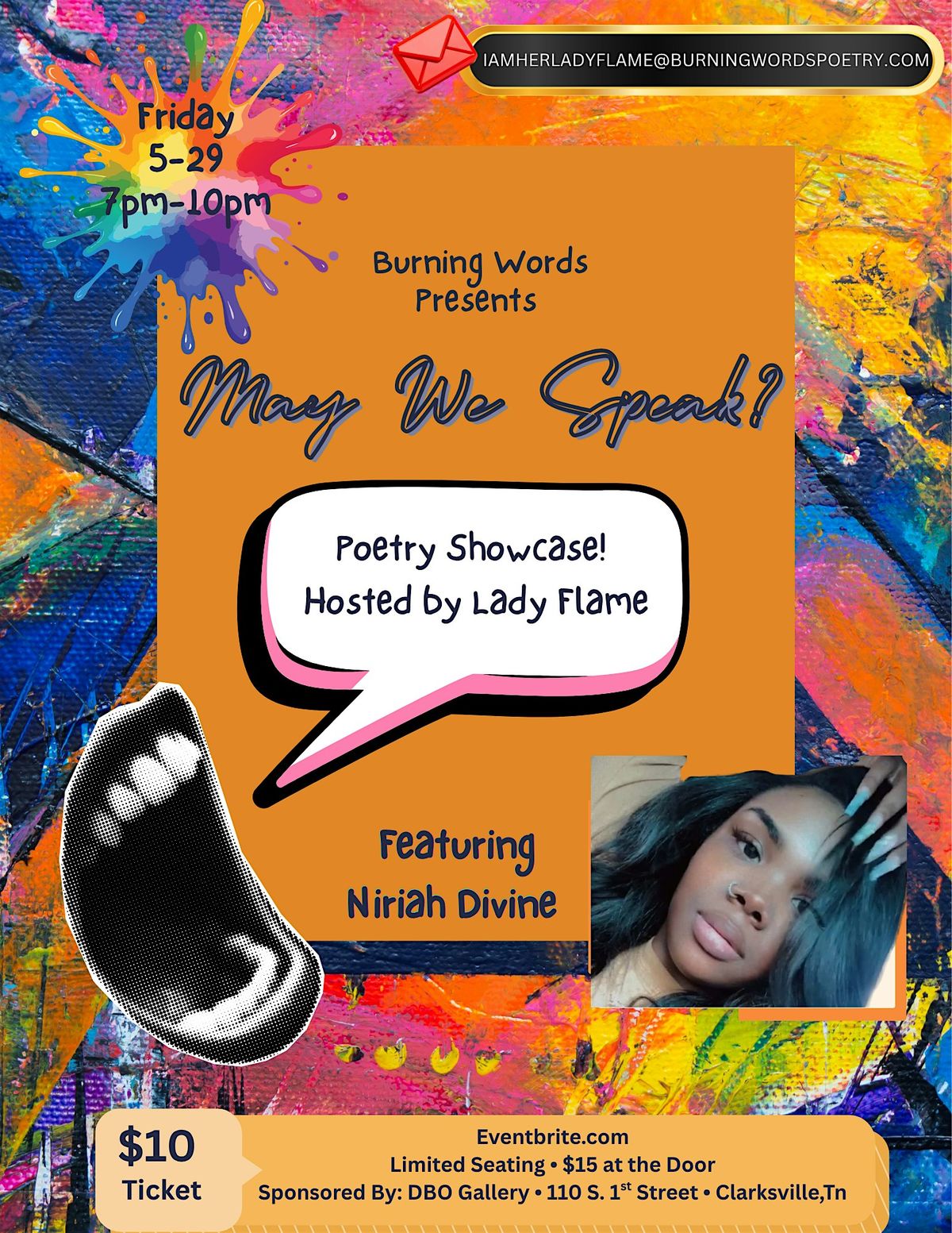 Join us on May 29th at DBO Gallery in downtown Clarksville for the May We Speak? Poetry Showcase featuring Niriah Divine.
