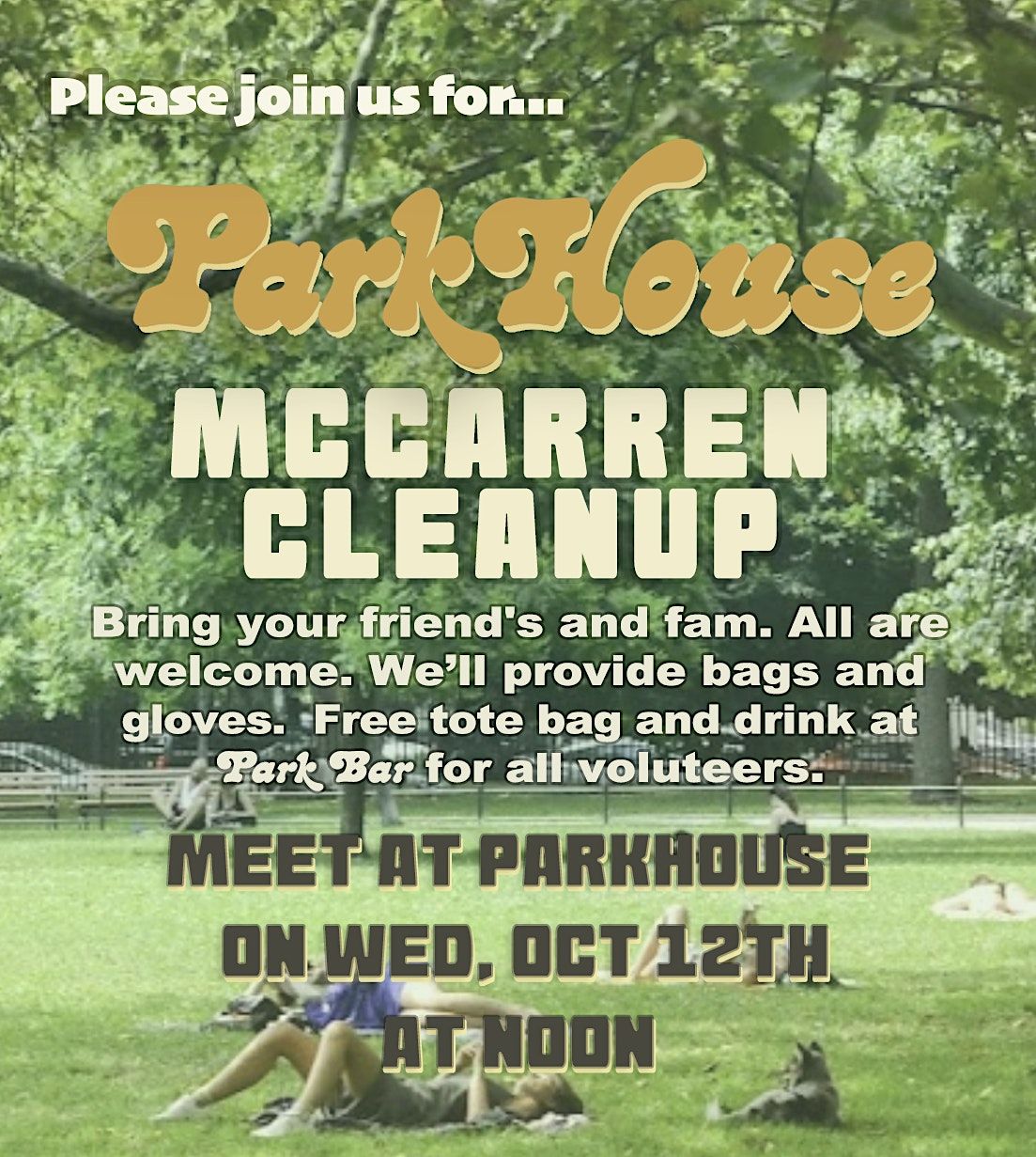 Join us for what will be a great way to make McCarren look pristine! We will provide trash grabbers, gloves and bags. We will meet at the back of the Parkhouse by the benches. Perfect for some pre-or-post lunch exercise if you are working that day. For all those who participate, we will provide a drink from Park Bar and a tote bag. Thanks in advance for your help!