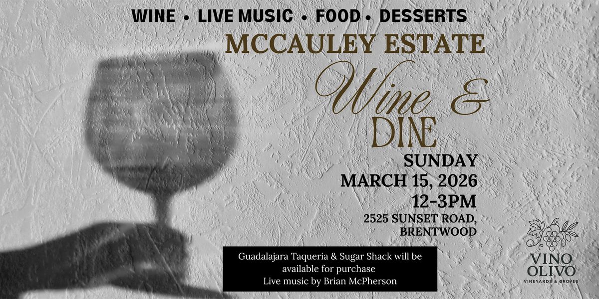 Join us for an unforgettable experience at McCauley Estates Wine and Dine. Immerse yourself in the perfect blend of fine wine, delicious food from Guadalajara Taqueria, sweet treats by Sherries Sugar Shack, and live music with Brian McPherson. Whether you’re a wine connoisseur or just looking for a fun day out, our Wine and Dine events offer something for everyone. Come with friends, family, or that special someone.To our Vino Olivo club members, Please be sure to stop by and grab your 1st quarter wine pick ups.We will be selling our wines by the glass, bottle, & flight.Indoor and outdoor seating will be available. Dates will vary from month to month, so keep an eye out for our wine tastings on our Facebook, Instagram, and our Website.