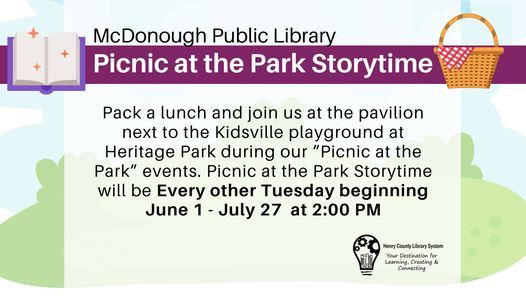 Pack a lunch and join us at the pavilion next to the Kidsville playground at Heritage Park during our “Picnic at the Park” events. Picnic at the Park Storytime will be Every other Tuesday beginning June 1 - July 27 at 2:00 PM
