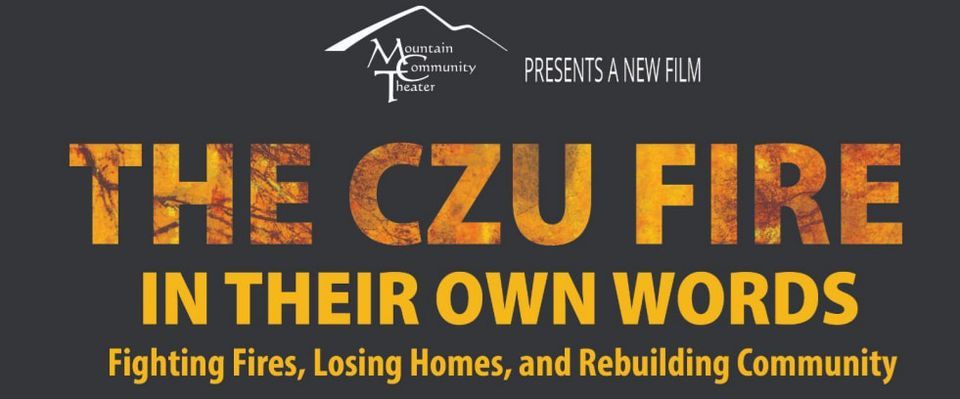 "The CZU Fire In Their Own Words - Fighting Fires, Losing Homes, and Rebuilding Community" is a new powerful and moving 90-minute film produced by Mountain Community Theater, created by Peter Gelblum.In the spring of 2021, in response to the August 2020 CZU Fires, we interviewed people who fought the fires and people who lost their homes about their experiences, which many of us shared - evacuating, losing homes and possessions to the fire, and getting support from the community. Using only the words from those interviews, we created a script, cast actors to play the interviewees, and used both the characters’ family photographs and images donated by several generous local photographers to create this film. The film is a document of that extraordinary time and a gift from MCT to the community.
