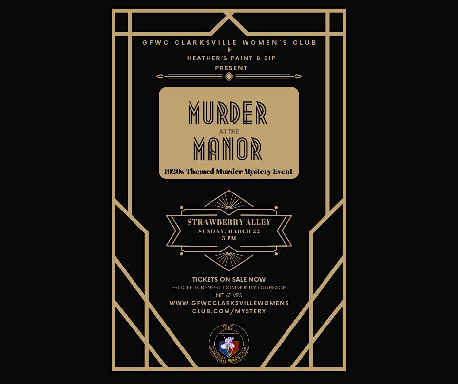 In partnership with Heather's Paint & Sip, this M**der mystery event is sure to be the cat's pajamas! Step back into the roaring 1920s for an evening of intrigue, glamour, and suspense at M**der at the Manor, a M**der mystery event hosted by GFWC Clarksville Women’s Club. Guests will enjoy heavy hors d’oeuvres, a cash bar, and an immersive whodunit experience at Strawberry Alley. Dress in your best 1920s-inspired attire and help crack the case—all while supporting a great cause. All proceeds benefit the club’s community outreach initiatives.