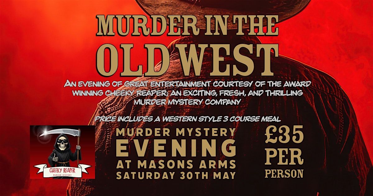 Step into the wild frontier for a night of fun and suspense! Join us at the Masons Arms as we unravel a thrilling M**der mystery set in the Old West. Bring your friends, put on your detective hat, and get ready for twists, turns, and plenty of laughs. Don't miss out on this unforgettable evening full of intrigue and excitement! Your ticket also includes a western style 3 course meal.