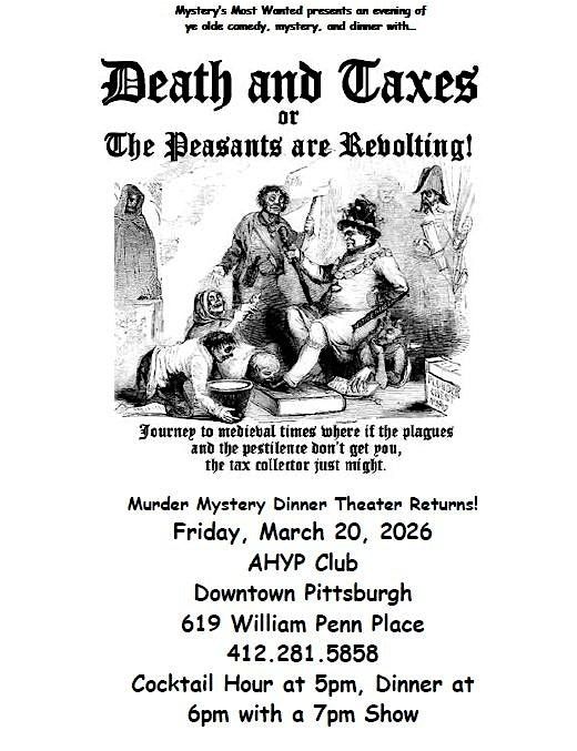 Pittsburgh's best M**der Mystery troupe returns to the AHYP Club with this great M**der mystery "Death and Taxes" or "The Peasants are Revolting"