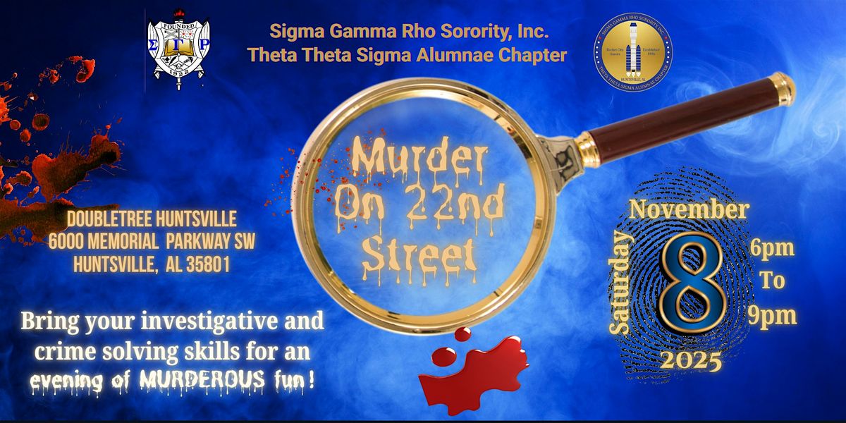 Come join the ladies of Theta Theta Sigma Chapter of Sigma Gamma Rho Sorority for an exciting evening at the DoubleTree Suites by Hilton Hotel Huntsville South for a thrilling M**der mystery event! Put on your detective hat to help solve the mysterious crime on 22nd Street. Get ready for an experience full of twists and turns as you gather clues and unravel the mystery. You definitely don’t want to miss out on this thrilling experience! Get ready for an unforgettable evening of drama and fun! It's going to be a KILLER evening.