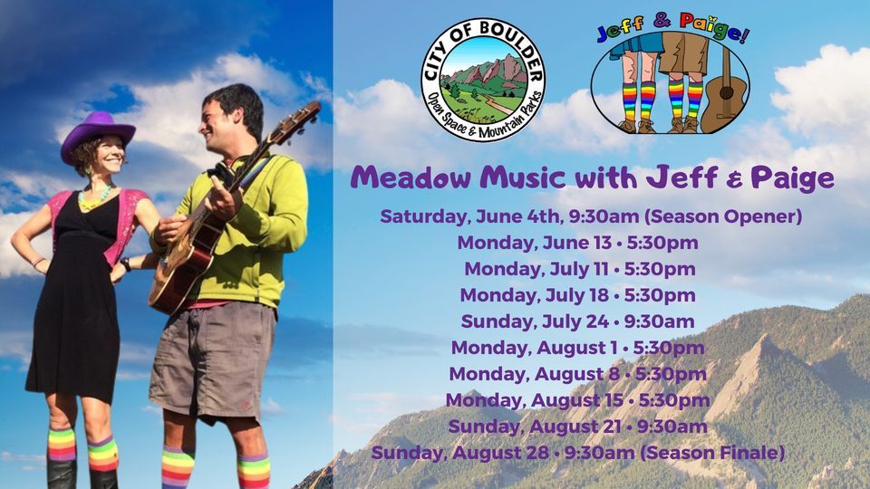 Season 18 of our family concert series beneath Boulder's Flatirons. Short hike followed by an outdoor, nature-themed kids' concert.Meadow Music 2022 will be back at Chautauqua Green! Hooray! We have 4 weekend morning shows and 6 Monday evening shows planned for you. Big break from mid-June through mid-July so that Jeff & Paige can visit their families ?