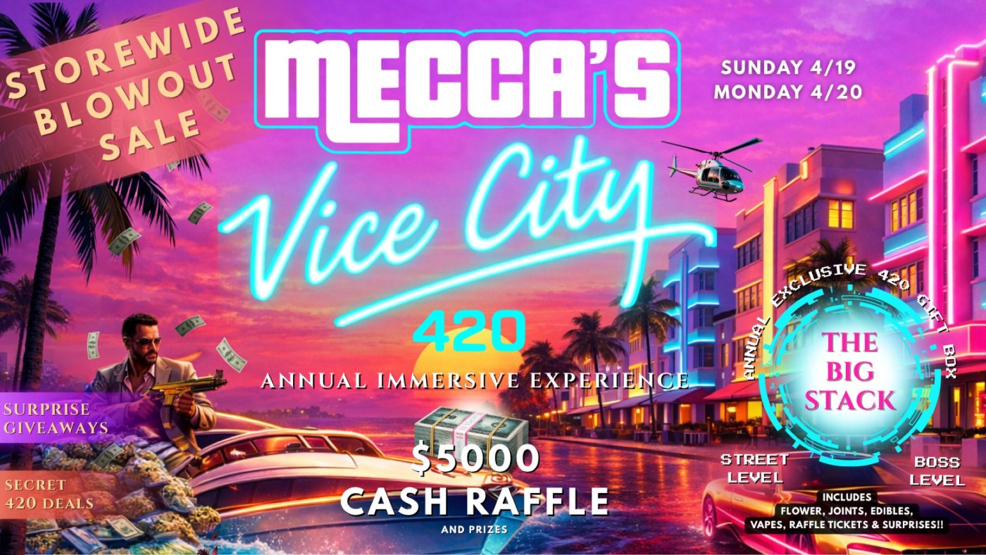 Step into Mecca’s Vice City 420 — a two-day experience packed with energy, prizes, and straight-up good vibes.