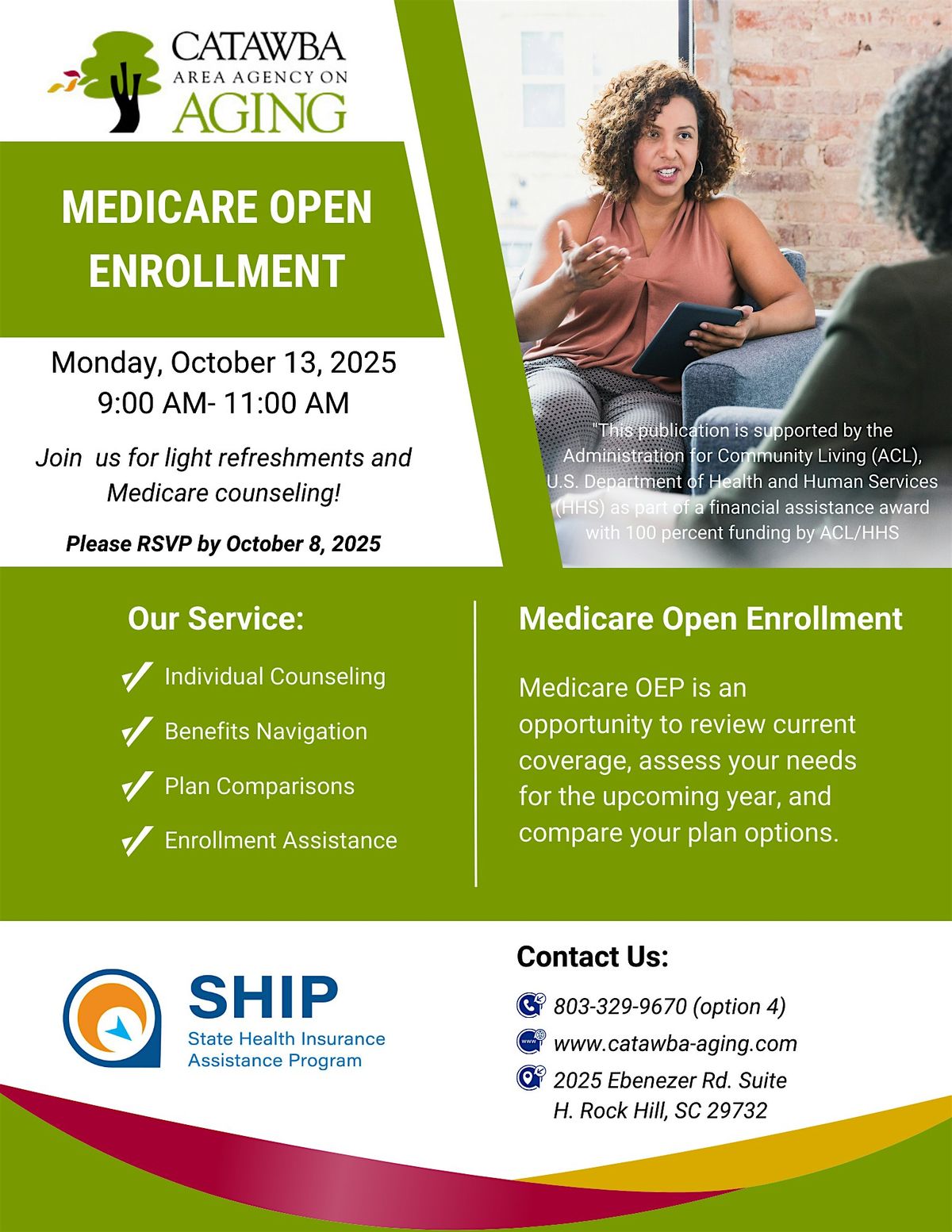 Come join us for the Medicare Open Enrollment event! Whether you're new to Medicare or looking to make changes to your current plan, this is the perfect opportunity to get all your questions answered. Our experts will be on hand to guide you through the process and help you find the best plan for your needs. Don't miss out on this chance to ensure you have the coverage you need. The event will be held at 2025 Ebenezer Rd suite h. See you there!