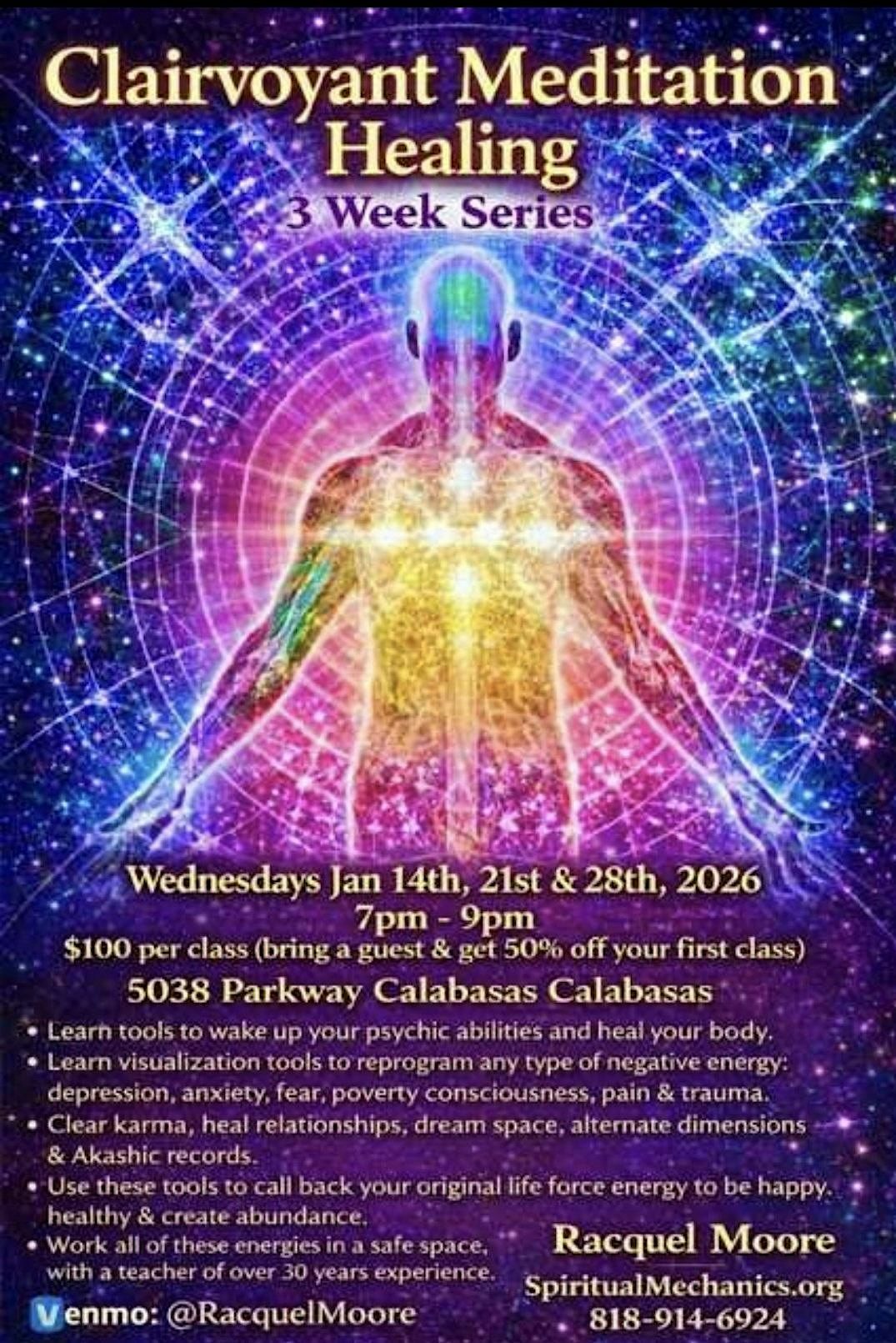 **Parking is at Ensele at the Calabasas address given. Spots are limited and classes are ongoing on every Wednesday for six consecutive Wednesdays starting on November 12 2025 starting at 7 PM until 9:30 PM. If you bring a guest it's 50% off. $100 per class. ***Racquel Moore is a very experienced clairvoyant, teacher, and healer with over 30 years of experience on many levels of spiritual advancement,. You will learn very advanced visualization meditation tools and they actually work. You'll get more insight, wisdom, and awareness in one class at these class series than you would have ever experienced anywhere else. Many of your unanswered questions will be finally answered. and understand the reason behind the chaos. Be prepared for the greatest frequency transformation for beings on this earth and over 50,000 years. Get ready for big positive changes in your life that could only start by you doing the actual inner work and learning these visualization and advanced energy tools really does the job. You will see much change for your highest in many ways and areas of your life.