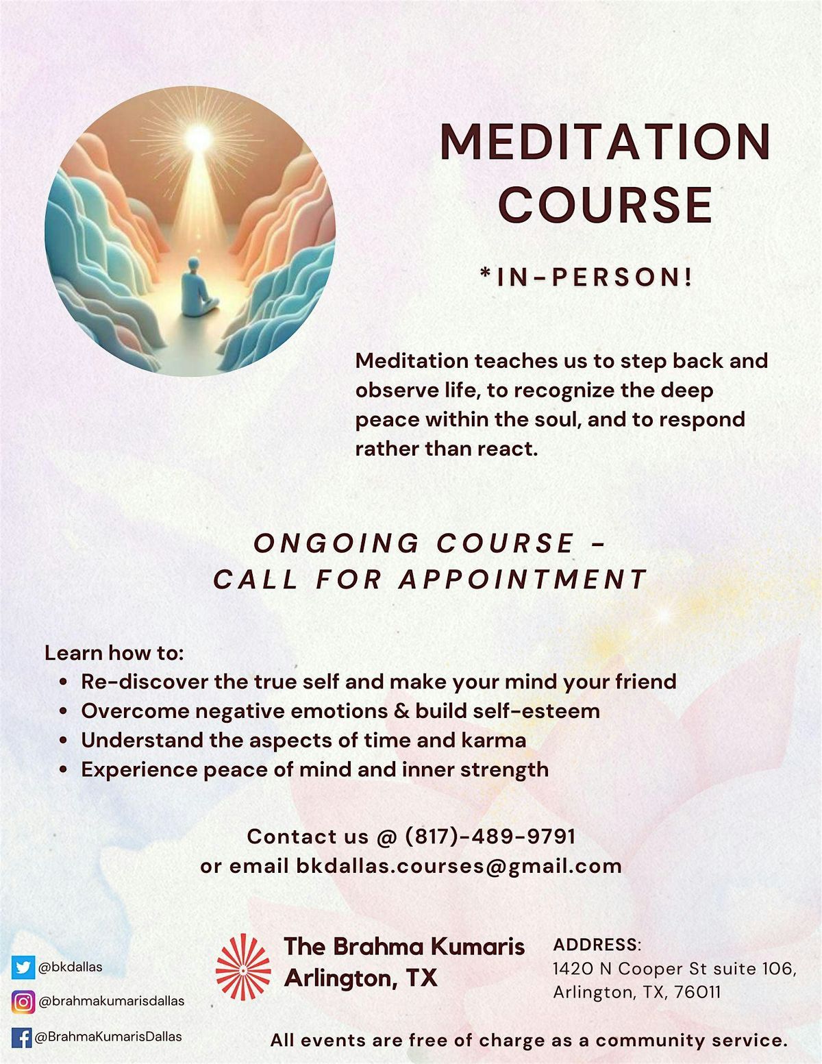 Join us for an in-person meditation course offered by The Brahma Kumaris, Arlington, TX. This is an ongoing course designed for beginners as well as those looking to deepen their meditation practice.