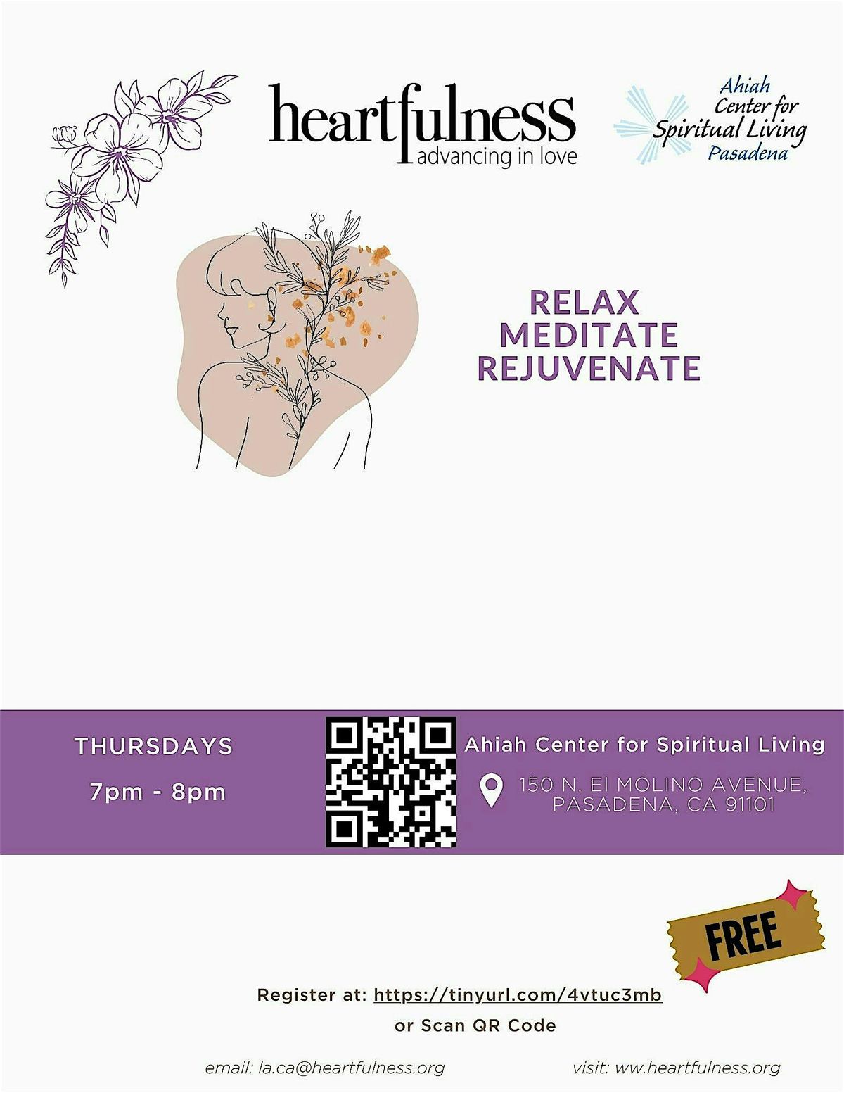 Feeling the weight of the week? Come join us at Ahiah Center for Spiritual Living Pasadena every Thursday at 150 N El Molino Ave from 7 PM to 8 PM by Wellness Meditation with Heartfulness. These insightful sessions focus on self-exploration and well-being, offering a space to relax, rejuvenate, and regain clarity. Whether you’re new to meditation or a seasoned practitioner on a spiritual journey, you’ll discover practical tools for self-help and personal growth.