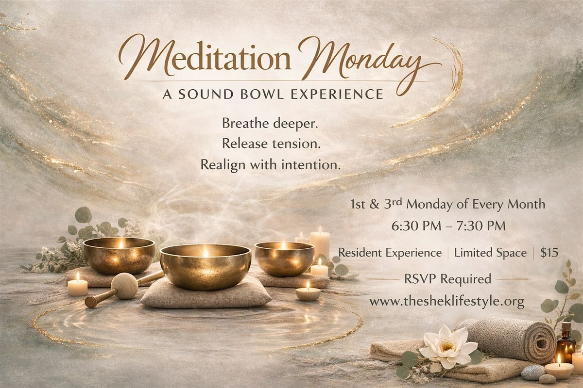Meditation Monday is a guided sound bowl experience designed to help you slow down, soften your nervous system, and reconnect with your intention. Through intentional breathwork, grounding meditation, and immersive sound healing, this experience creates space for release, clarity, and realignment.