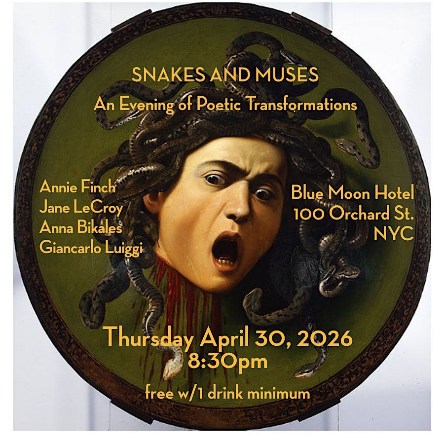 In the historic Blue Moon Hotel, Poetry Witch Annie Finch & Performance Goddess Jane LeCroy, with harpist Anna Bikales, form a spiral of Goddess transformation: snaking spells for a time of patriarchal war. Slither out of National Poetry Month infused with the music and literary magic of Medusa and the Muses to carry you through another year of changing skin. Giancarlo Luiggi opens the ceremony with a reading of Sufi poetry, including translations of Rumi from Haleh Liza Gafori.
