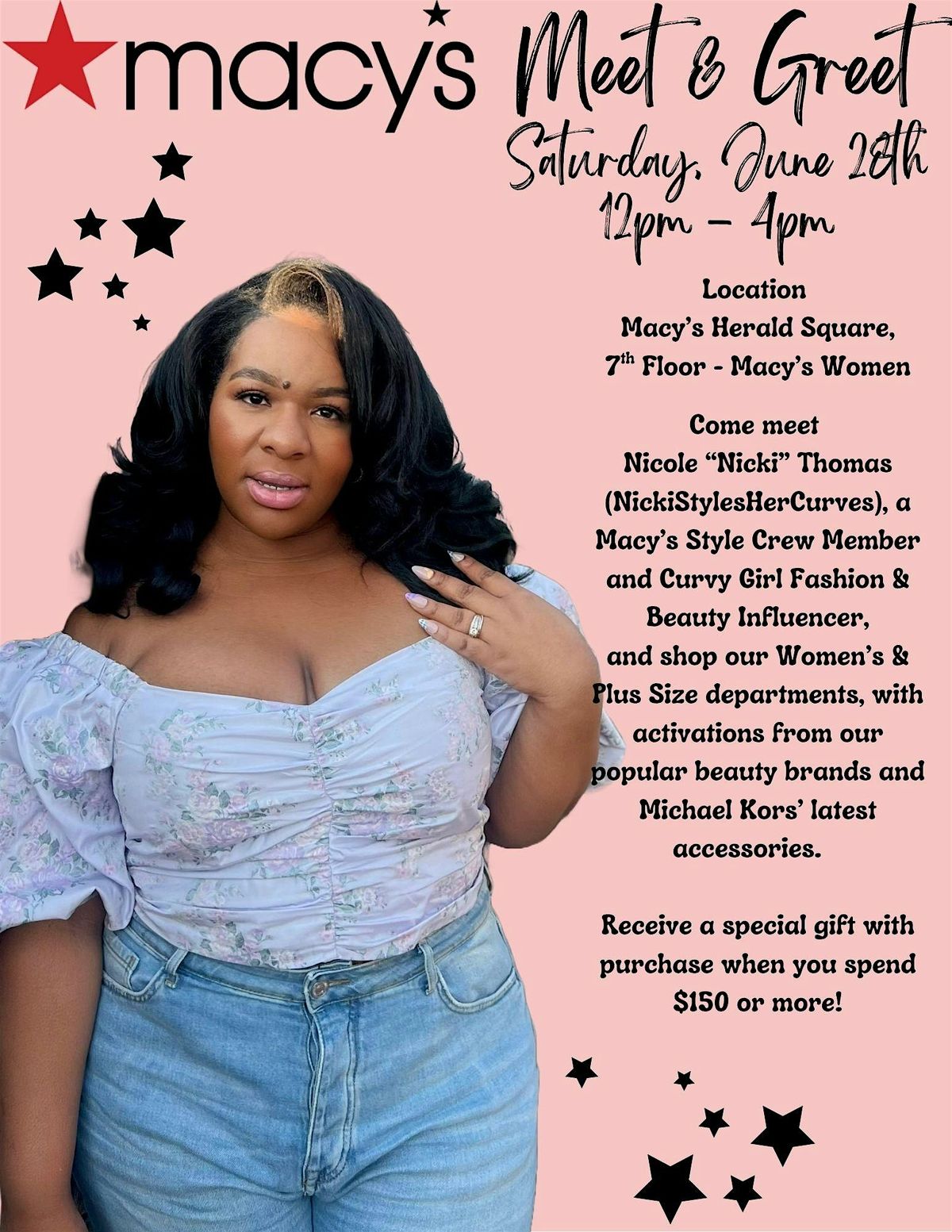 Welcome to the Meet and Greet with NickiStylesHerCurves event at Macy's! Come meet the fabulous Nicki and chat about all things fashion and curves. Get styling tips, take selfies, and check out new beauty trends. This is your chance to hang out, shop and get style advice in person. So mark your calendars and get ready for a fun-filled day at Macy's!