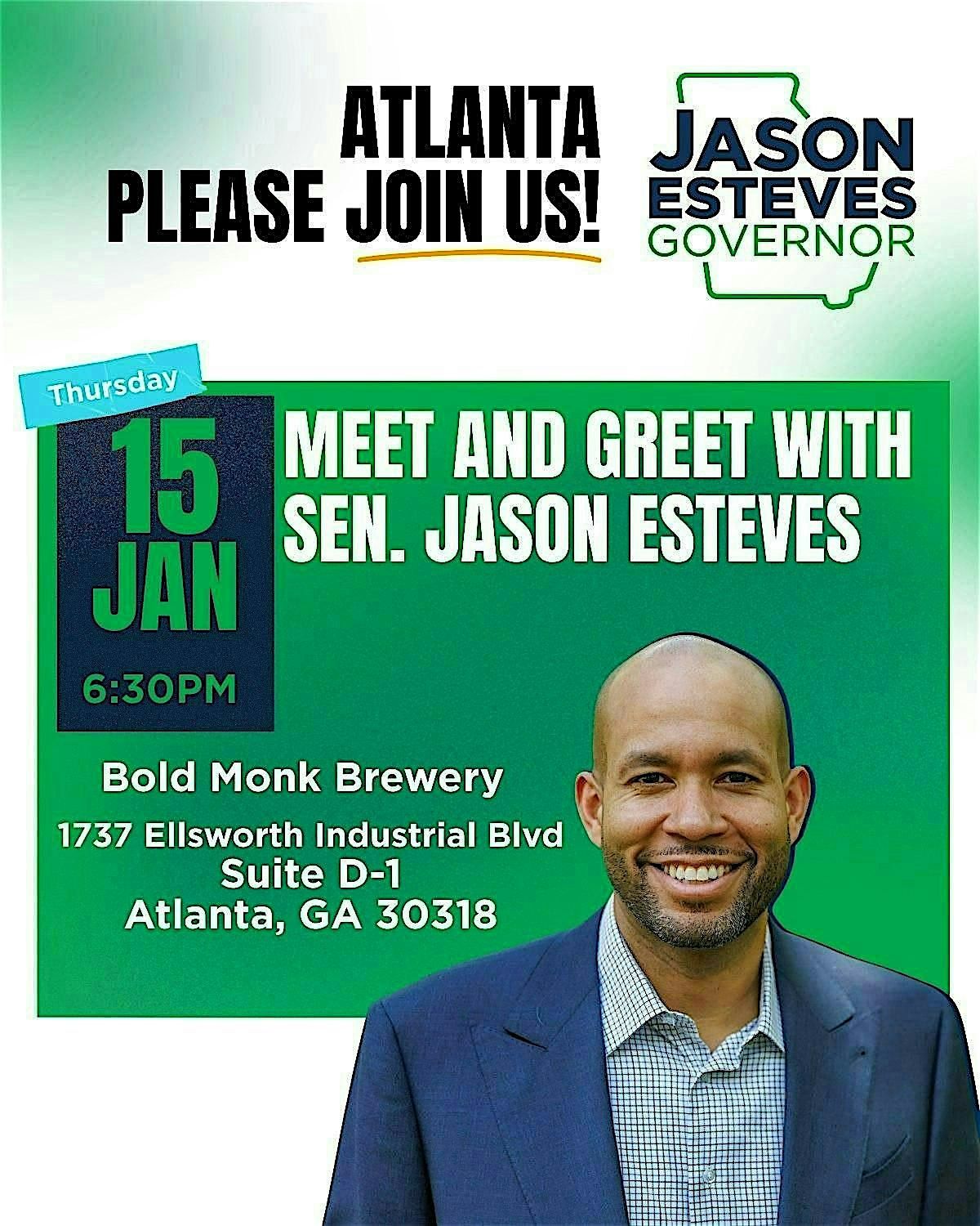 Join us for an engaging evening with Senator Jason Esteves, candidate for Governor of Georgia. This special gathering offers an opportunity to meet Jason in person, hear directly about his vision for Georgia’s future, and engage in meaningful conversation about the issues that matter most to our communities.