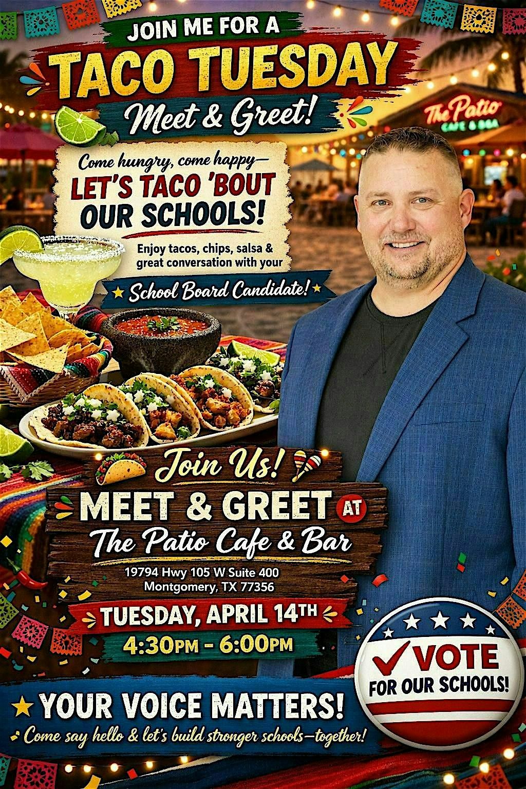 Join us for a Taco Tuesday Meet & Greet in support of Matt Mitchell for Montgomery ISD Position 3.
