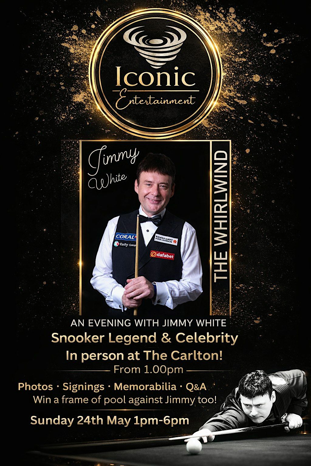 An evening with Jimmy White MBE. Join our event including pics, signings, memorabilia , Talk / Q&A & even play a pool frame against Jimmy!Agenda