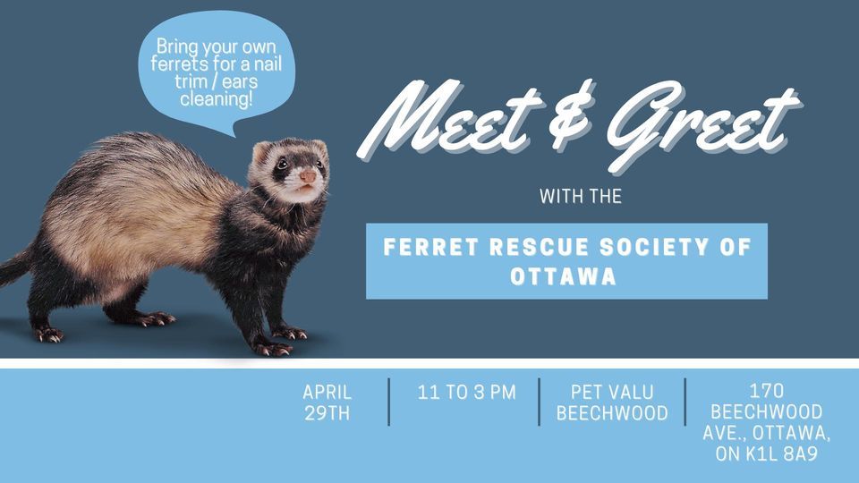 Meet us at Pet Valu Beechwood to chat about ferrets, meet some of our residents, learn more about the rescue and bring along your ferret!We will be offering nail trims and ear cleanings for your ferret as a way to raise funds for the rescue!